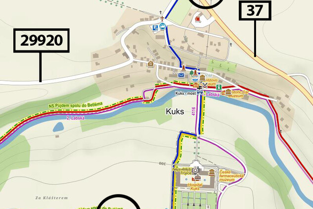 Kuksem dále vedou další cyklotrasy – 2 (24) (Labská Vrchlabí – Skalička), 4098 (Choustníkovo Hradiště – Ratibořice), 4116 (na Chotěborky).