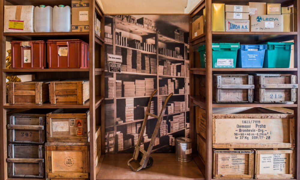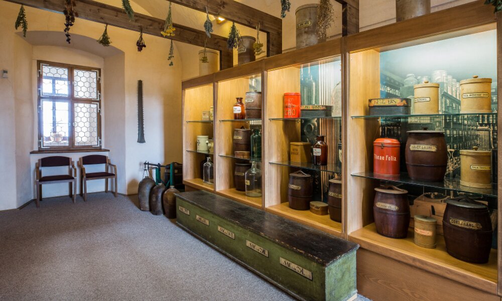 Expozice Českého farmaceutického muzea zvaná „Kouzlo apatyky“ představuje vývoj lékáren od baroka do 20. století, a další oblasti farmacie jako výzkum, školství nebo vojenskou farmacii.
