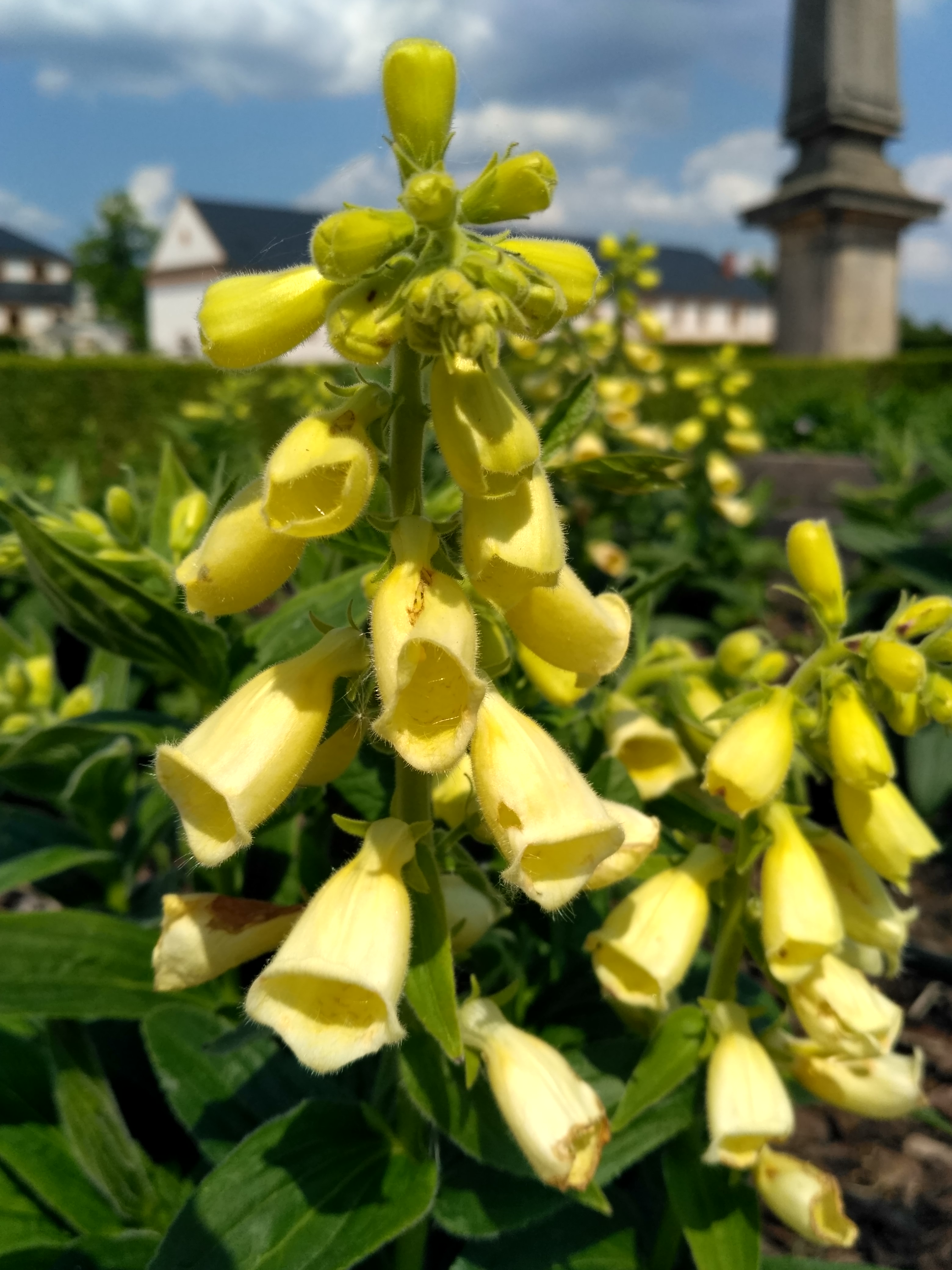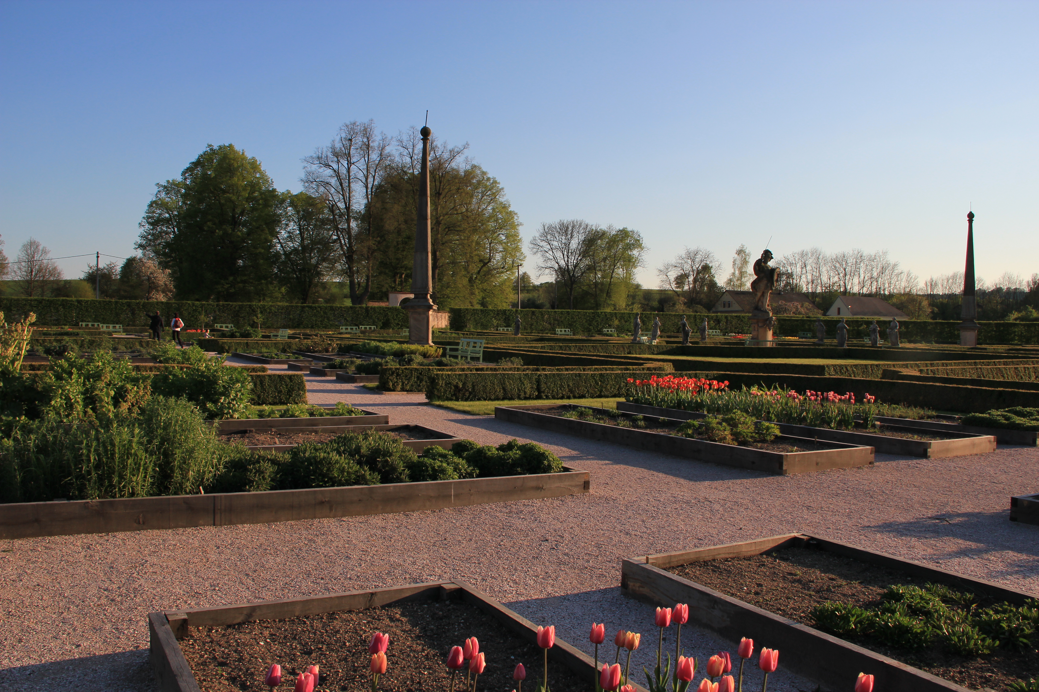 Po obou stranách vidíme dva štíhlé obelisky, jež stávaly kdysi na lázeňském rejdišti na labském břehu; jehlany nesly původně polychromované (barevné) sochy Pravdy a Spravedlnosti.